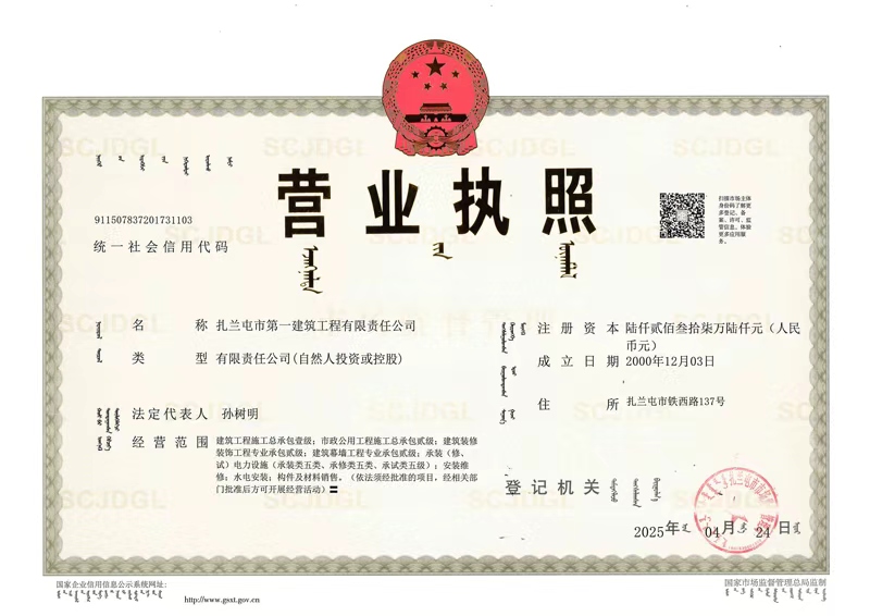公司的前身是扎蘭屯市第一建筑工程公司,始建于1958年3月1日。2000年12月轉(zhuǎn)制為有限責(zé)任公司,是房屋建筑工程施工總承包壹級(jí)、房地產(chǎn)開(kāi)發(fā)貳級(jí)、市政公用工程施工總承包貳級(jí)、商品砼攪拌站、園林綠化公司叁級(jí)、建筑裝修裝飾工程專(zhuān)業(yè)承包貳級(jí)、起重設(shè)備安裝工程專(zhuān)業(yè)承包叁級(jí)企業(yè)。具有建筑、房地產(chǎn)開(kāi)發(fā)、市政工程、商品砼、園林綠化、裝修裝飾等工程的綜合施工能力。公司有五十余年的建筑施工管理經(jīng)驗(yàn),并于2002年7月5日正式通過(guò)了ISO9001:2000國(guó)際質(zhì)量標(biāo)準(zhǔn)認(rèn)證。